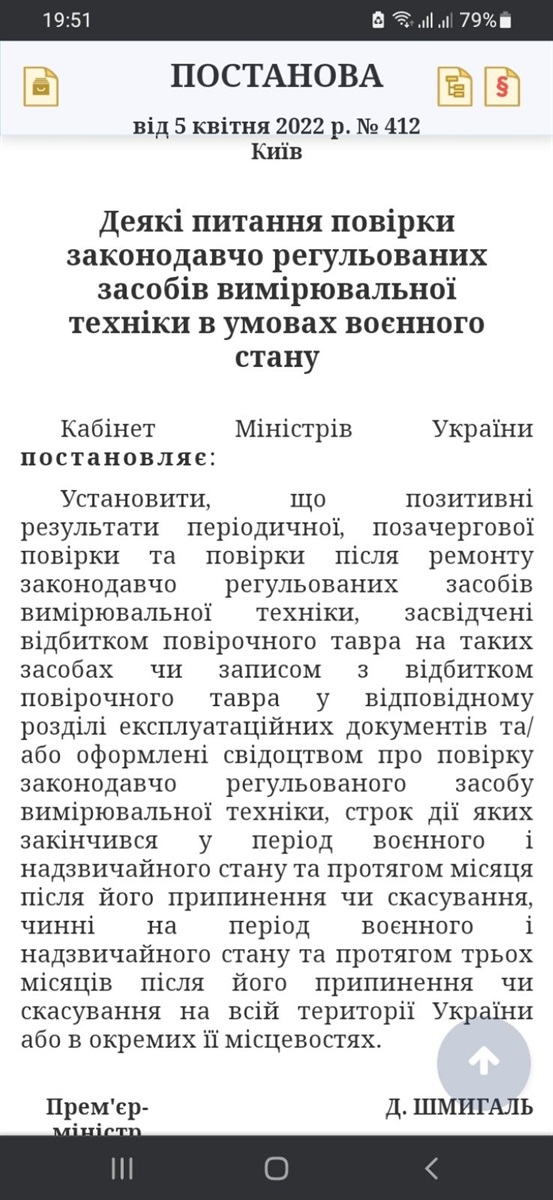 - А для воєнного часу було зроблено поправки – 5 квітня 2022 року Кабмін ухвалив постанову № 412 «Про деякі питання перевірки законодавчо регульованих засобів вимірювальної техніки в умовах воєнного часу». Відповідно до цієї постанови, якщо термін повірки лічильника припав на період дії воєнного стану, то його повірку можна не робити. Причому цей дозвіл діятиме як протягом усього періоду воєнного стану, так і ще три місяці після нього. До цього всі показання лічильника вважаються дійсними і постачальники послуг мають їх приймати.