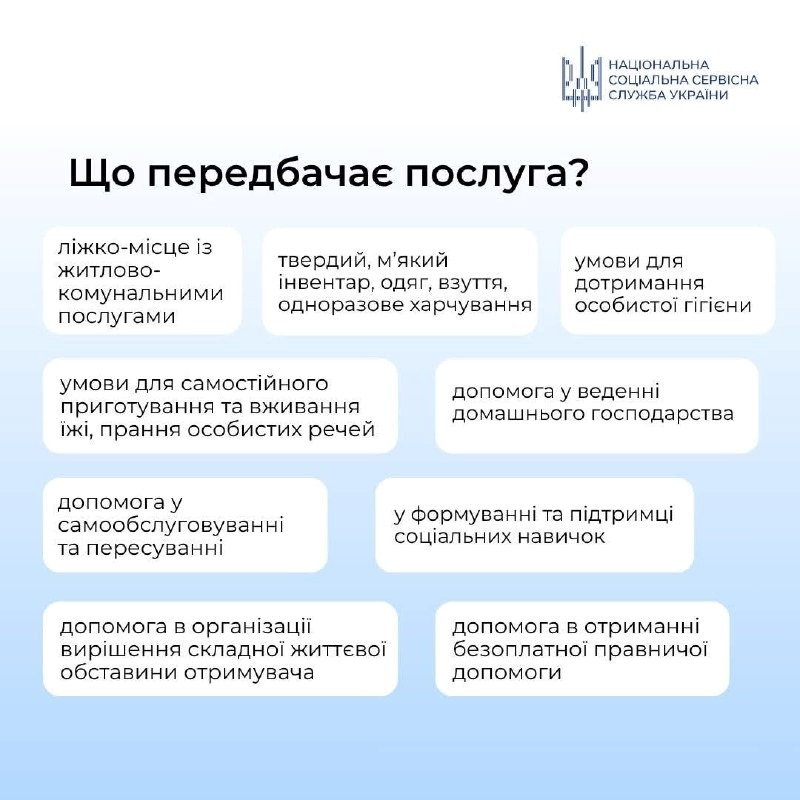 Фахівці забезпечують отримувачам належні умови для проживання, можливість самостійного приготування та приймання їжі, допомогу під час пересування, а також сприяють у самообслуговуванні та розвитку важливих соціальних навичок.