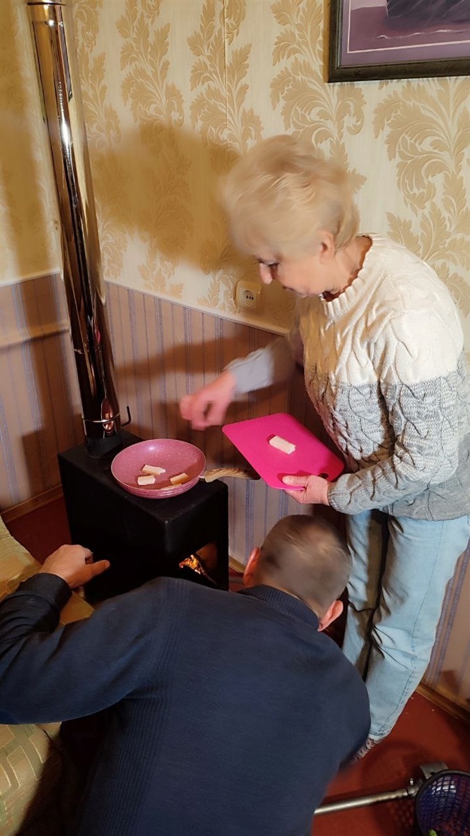 Пічка має ще додаткову функцію – на ній можна підігріти їжу. Пані Валентина на пательню кладе сало, щоб наочно нам це продемонструвати. На підсмаження вистачає хвилини і смакота вже на тарілці. "Пічка-Марічка" вже чотири дні успішно функціонує, пройшовши перше випробування. В надзвичайній ситуації це простий і доступний спосіб пережити складні зимові умови у випадку блекауту, головне - суворо дотримуватись усіх правил пожежної безпеки.