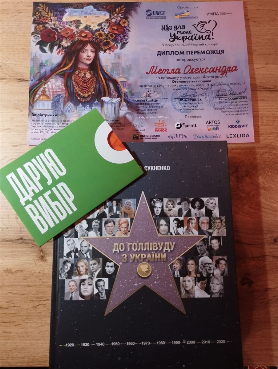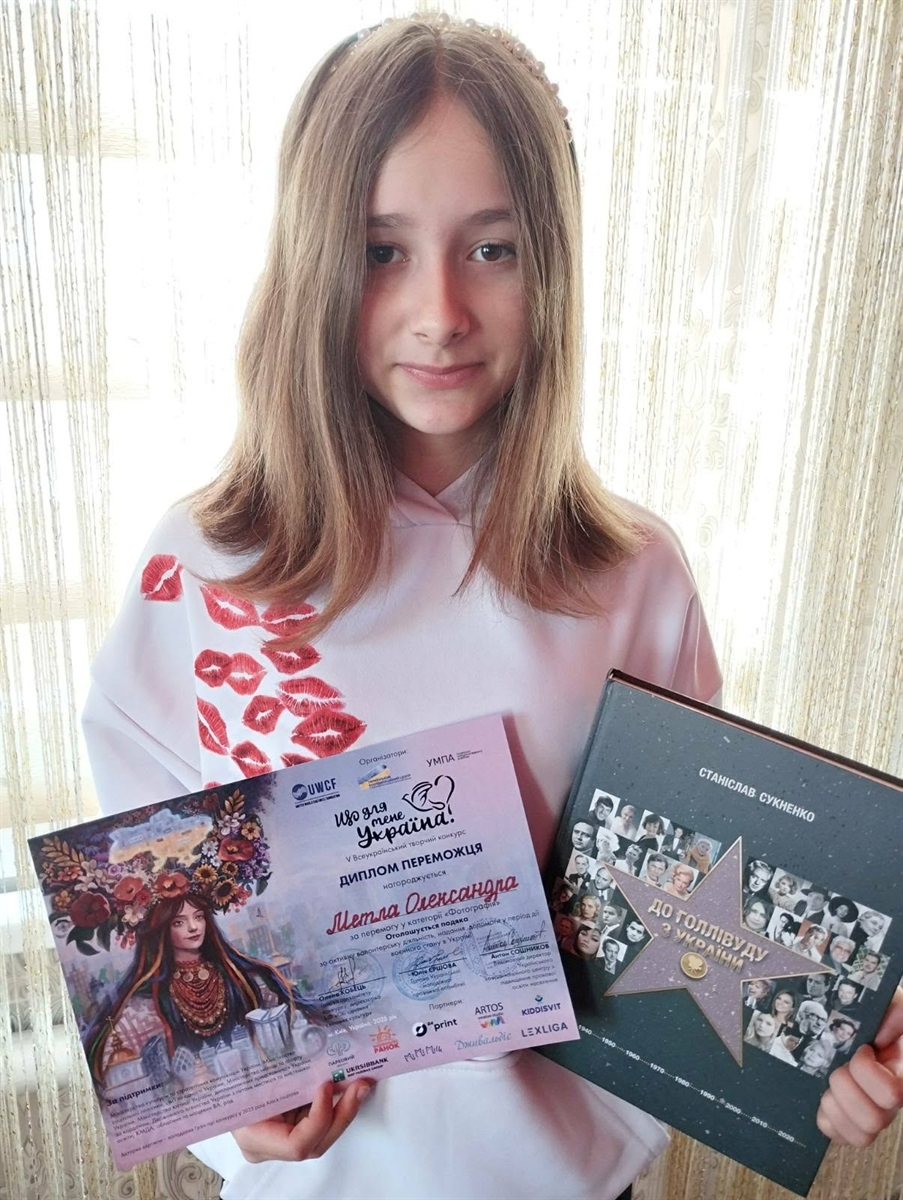 Олександра увійшла до десятки фіналістів серед 263 робіт і здобула перемогу. Вона отримала диплом, чудову глянцеву книгу про українців-емігрантів, які підкорили Голлівуд, а також сертифікат у “Comfy” на 1000 гривень.
